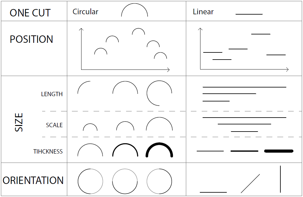 We explored how data can be mapped in KiriPhys by describing the variables that are available in KiriPhys to encode data. As the first step, we explored the distinguishable ways that one cut can be placed on paper. A single cut is comparable to a single visual mark in that it can also be a point, a line, or an area. Single cuts do not have value or color but can be varied in shape, position, size, and orientation.