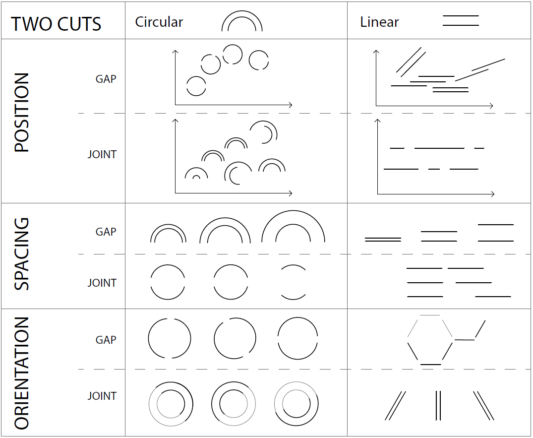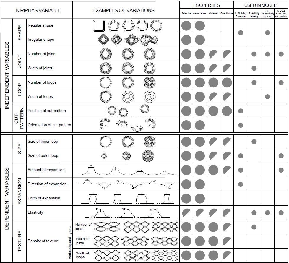 Independent KiriPhys variables are those supporting direct data mappings, i.e. quantitative parameters of the cut pattern that can directly encode data values. Note that although cut patterns can be varied using traditional independent visual variables such as colour, position, size and orientation, we do not detail these since they behave similarly to their visual variable counterparts. We identified six independent KiriPhys cut pattern variables: