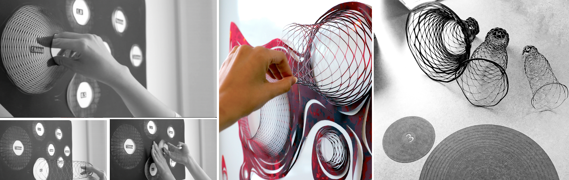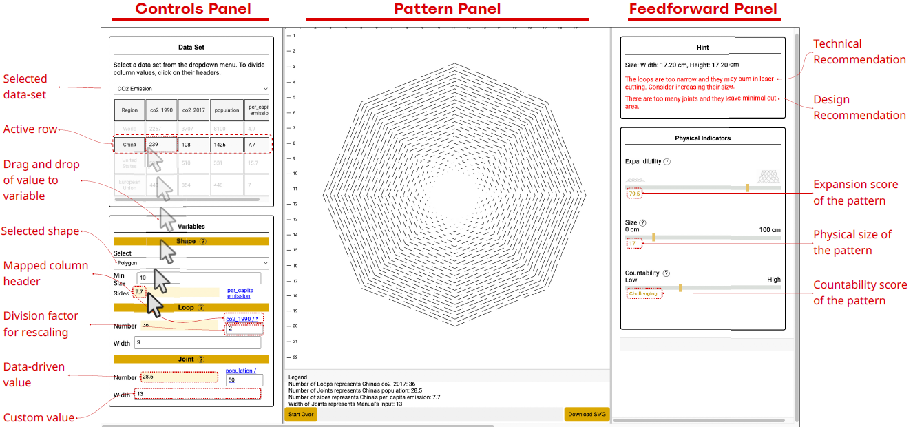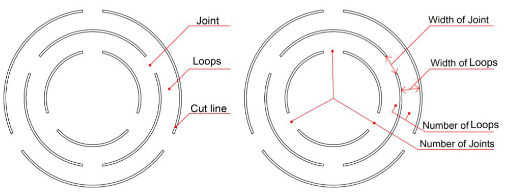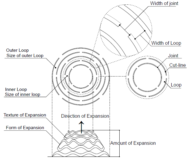 A cut pattern consists of cut lines (formed by alternating cuts and joints) arranged in a concentric or parallel manner. Varying the width of joints will affect the length of the cuts. The rings (for concentric cut lines) or stripes (for parallel cut lines) of solid material between two cut lines are called loops, and the width of these loops can be varied. The pattern has an inner loop of a given shape and size, as well as an outer loop that also has a given shape and size. All these variables affect the cut pattern’s expansion amount, direction, and texture that are revealed upon interactively pushing or pulling the cut pattern.