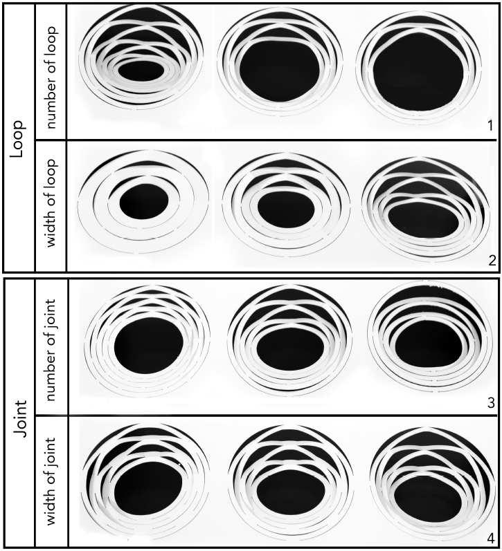 - The amount of expansion captures the height and volume of a cut pattern when fully expanded. This is influenced by the flexibility of the material and the variations in the cut pattern’s independent variables: a smaller number of joints and/or narrower joints leads to more expansion, while a smaller number of loops and/or narrower loops leads to less expansion.